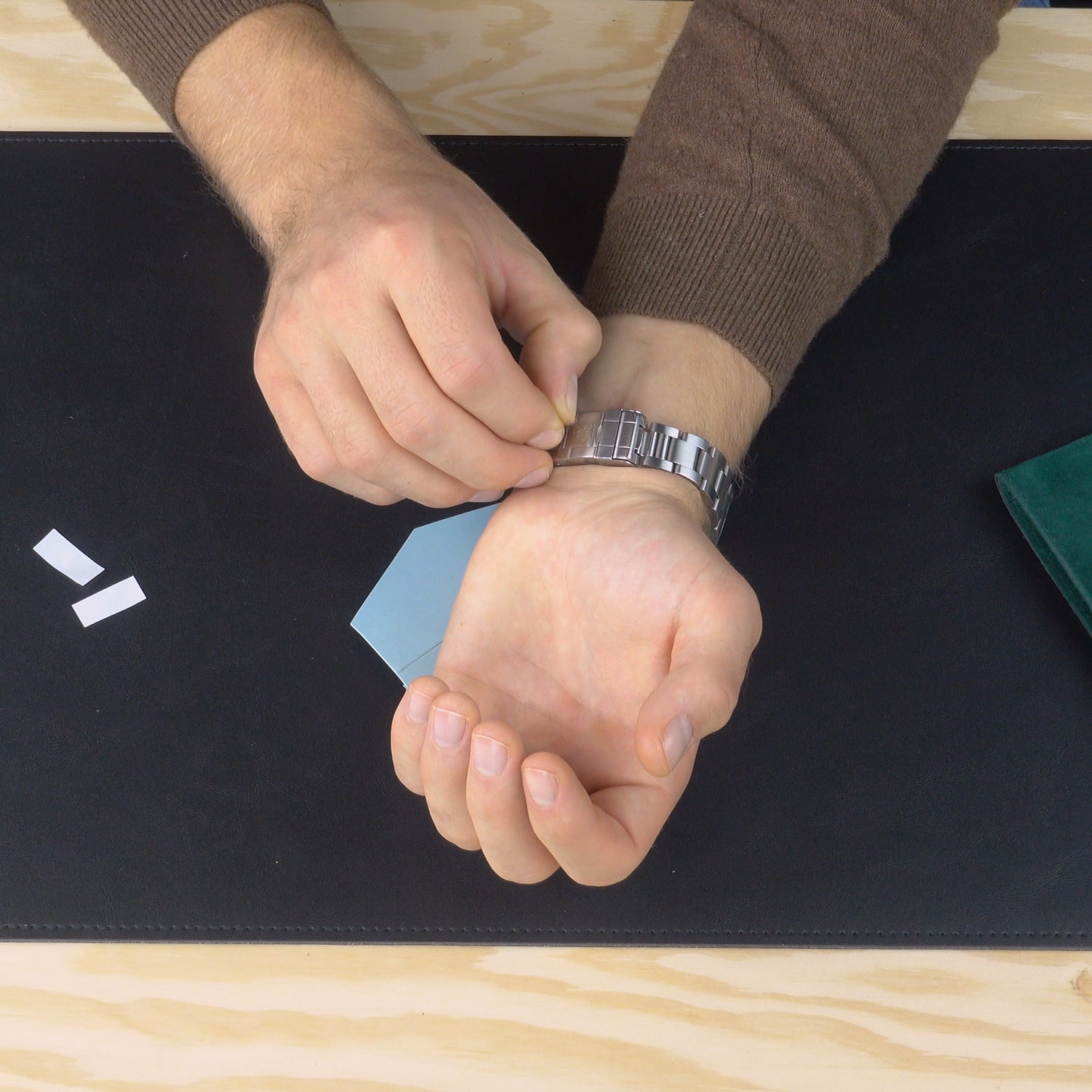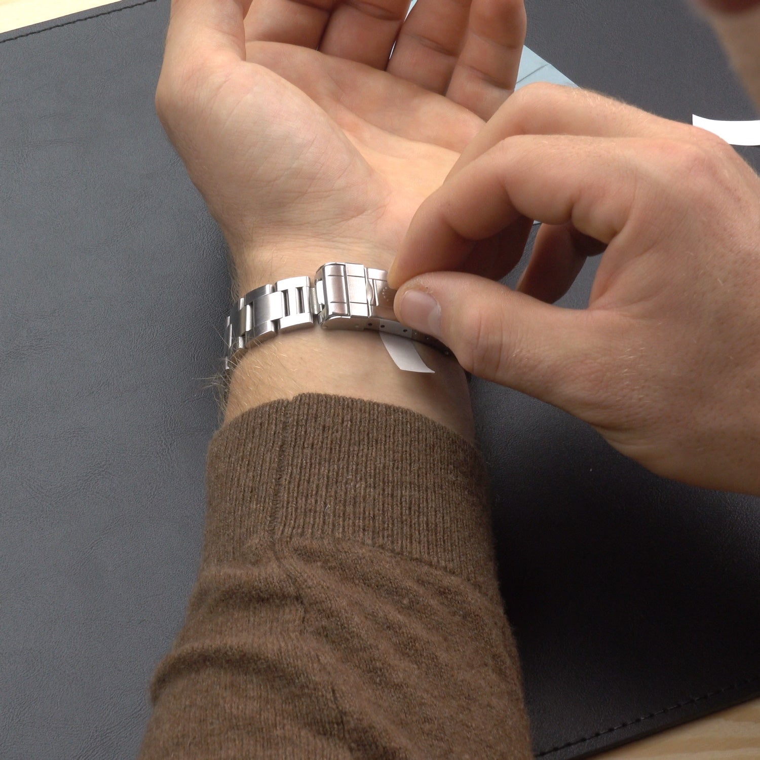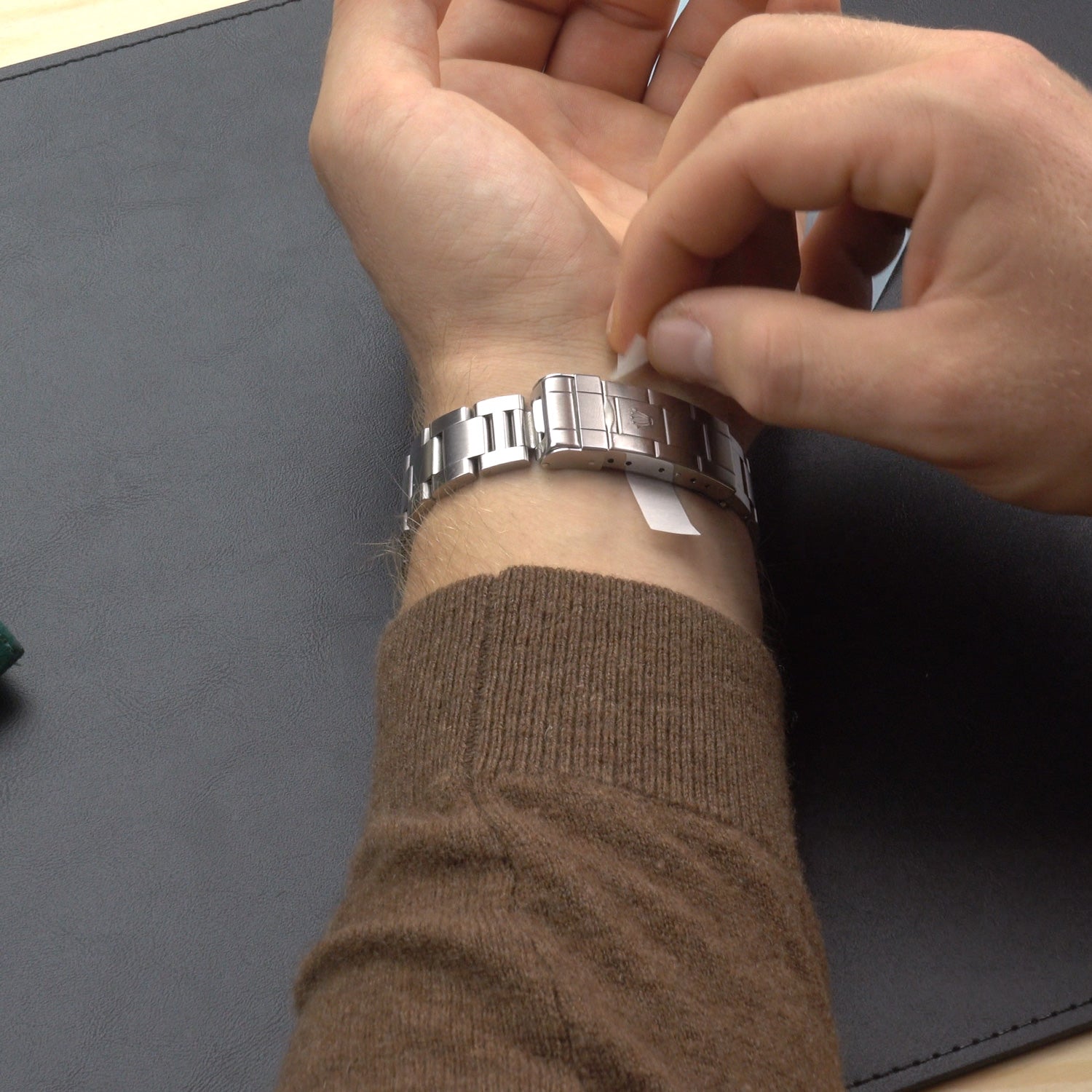 Place it under your watch clasp with the removable parts facing away from your wrist.